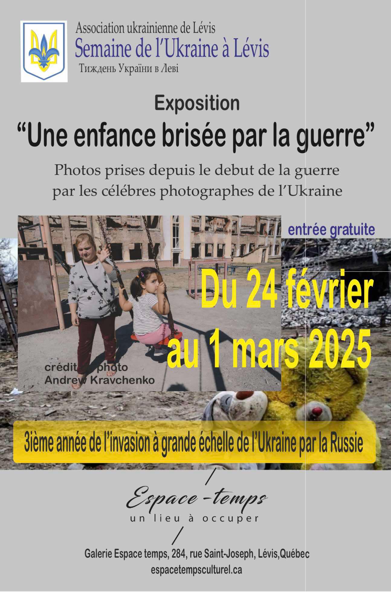 En ce triste 3’ième anniversaire de l’agression russe à l’endroit de l’Ukraine et de son peuple, et dans le cadre de la semaine Semaine de l’Ukraine à Lévis, nous vous invitons à cette exposition qui se tiendras à 19h00 à la Galerie Espace-temps, située au 284 rue Saint-Joseph à Lévis. Merci de soutenir l’Ukraine!